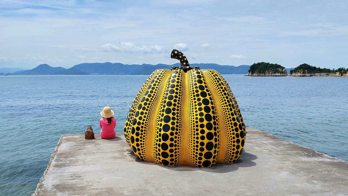 第三天九時出發,乘巴士到宇野港轉乘小輪到直島。一上岸立刻轉乘島上小巴去地中美術館參觀安藤忠雄清水混凝土牆建築。隨後到附近海灘與草間彌生的黃色南瓜合照。剛好有一穿上粉紅色上衣的少女背著我們與南瓜合照,我也把握機會即時按下快門,拍得了今次旅行最滿意的照片。