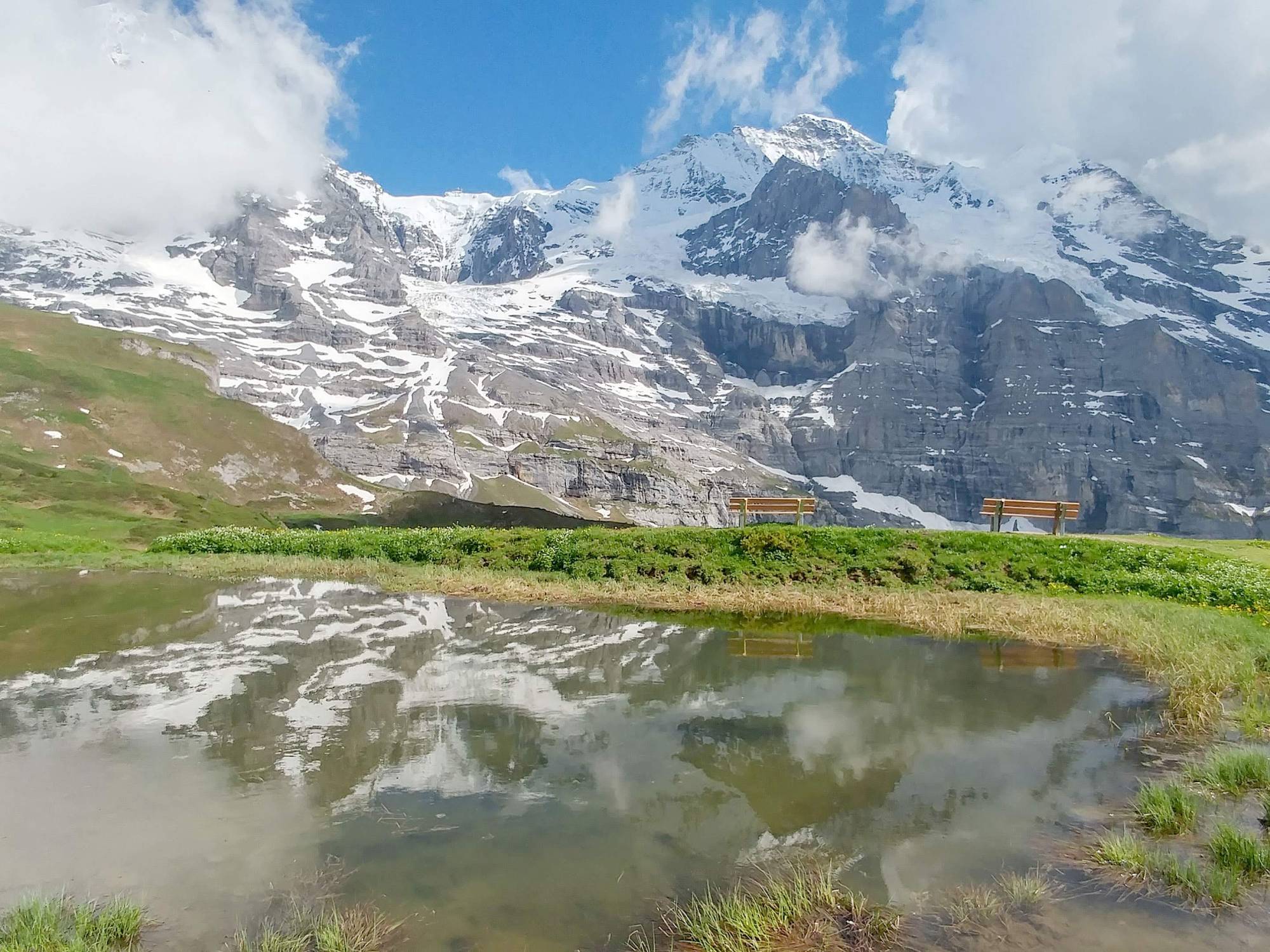 幸好之前已經有人 橫過,我便跟隨那些腳印小心翼翼地踏過了雪 覆蓋的一段路, 最後都安全到達下一個站與太太們會合。有驚無險。定過神後便一齊步行到 Wengernalp,