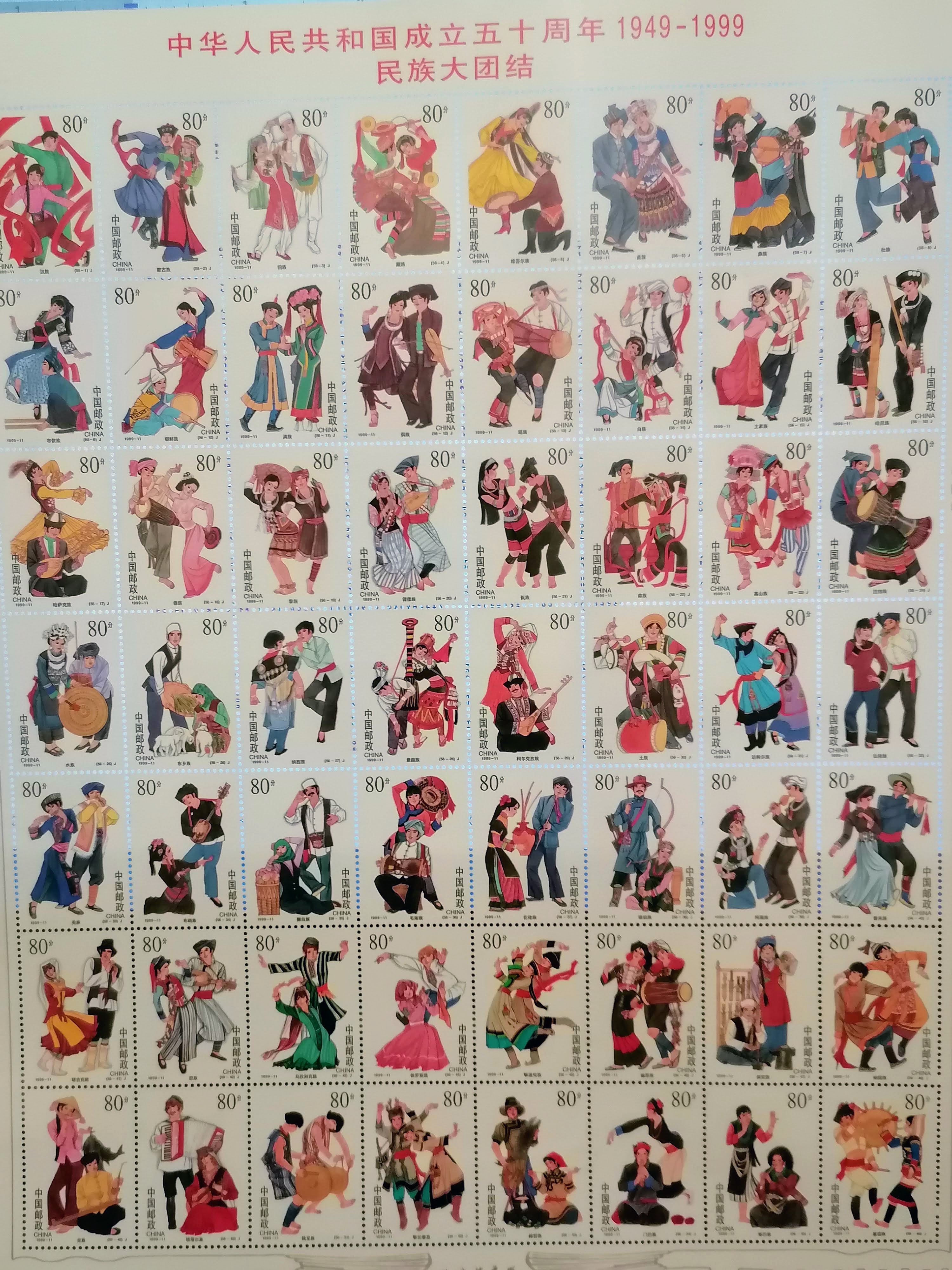 1999年10月1號,中國發行中華人民共和國成立50週年民族大團結紀念郵票全套五十六枚郵票。是全世界枚數最多的套票版張。