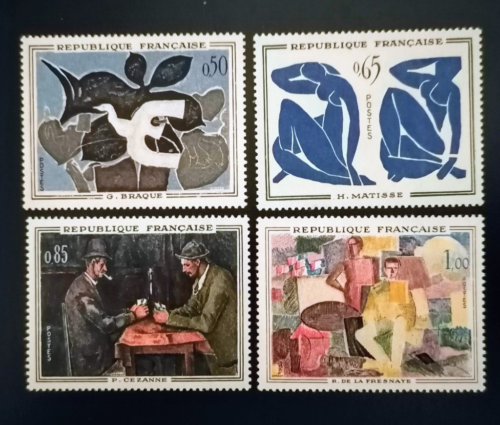 法國在1961年發行了第一套名畫專題郵票,裏面有布拉克 G. Braque信使者,馬提斯 M.Matisse藍色裸女 ,塞尚 P.Cezanne 玩紙牌的人及佛里奈 R. De.La. Fresnaye 7月14日法國國慶。
