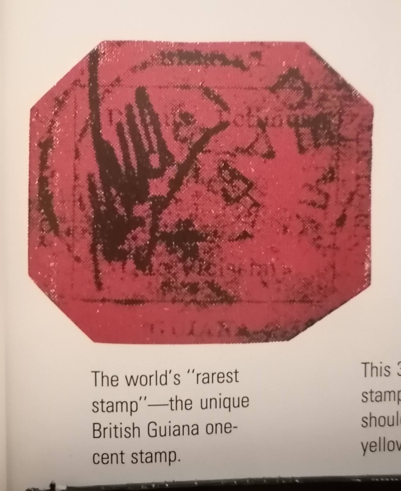 1856年初,英屬圭亞那當地的郵票短缺,新印刷的還未從英國送到,因此只能在當地報紙印刷廠內趕印了少量的洋紅色1分和藍色4分郵票。這些郵票印刷的非常粗糙。其中洋紅色一分郵票主要用來貼用新聞報,因此非常罕見。 有165年歷史 ,四周邊紙品相奇差,早已被人修剪成八角形模樣,卻不損其至高無上的地位。1980年該郵票以 93.5萬美元的高價拍出,加上稅項買主實際付出近100萬美元 2021年6月倫敦蘇富比拍賣 ,賣出 830萬美元。