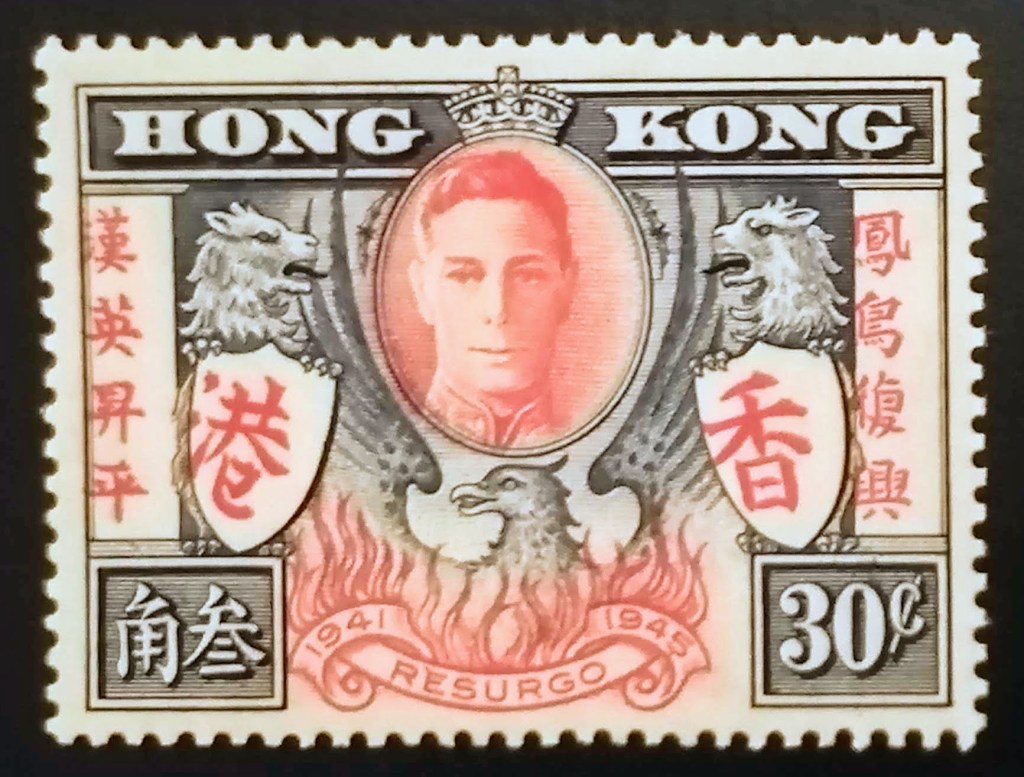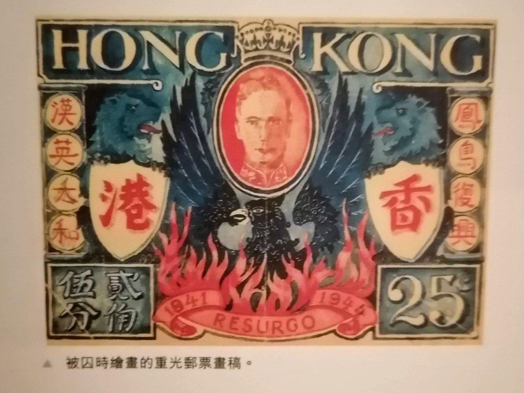 重光一周年後,1946年8月29日香港發行的勝利和平紀念郵票 是香港第五套紀念郵票 。該套郵票的主圖是由時任工務局的高級繪圖主任鍾偉霖 與郵政司榮鍾思( Edward Irvine Wynne-Jones) 於日治時期被囚禁在集中營內時秘密設計的 。畫稿 上有一對皇室獅子捧著兩塊 盾牌, 盾牌上 各刻有香港兩字,兩旁有中文字鳳鳥復興與漢英大 和 。喬治六世頭像兩旁有一對蝙蝠代表好運和長壽 。當時假如日軍看見這設計一定不會高興 ,所以收藏這套郵票設計是 頗為危險的事。