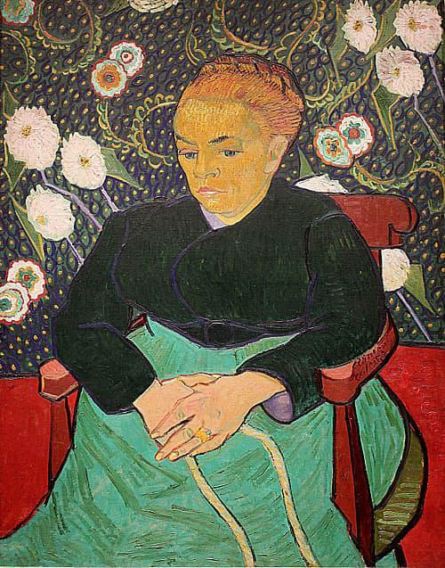 1888年12月,高更即將離開 。梵高為了排遣煩躁的情緒 便 畫了以郵差老蘭先生的夫人為模特兒的畫。畫中模特兒 安寧而肅靜的面龐 與及像慈母一般的女神坐在高更的扶手椅上,佔據了他所遺留下的空間。