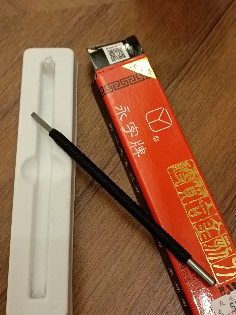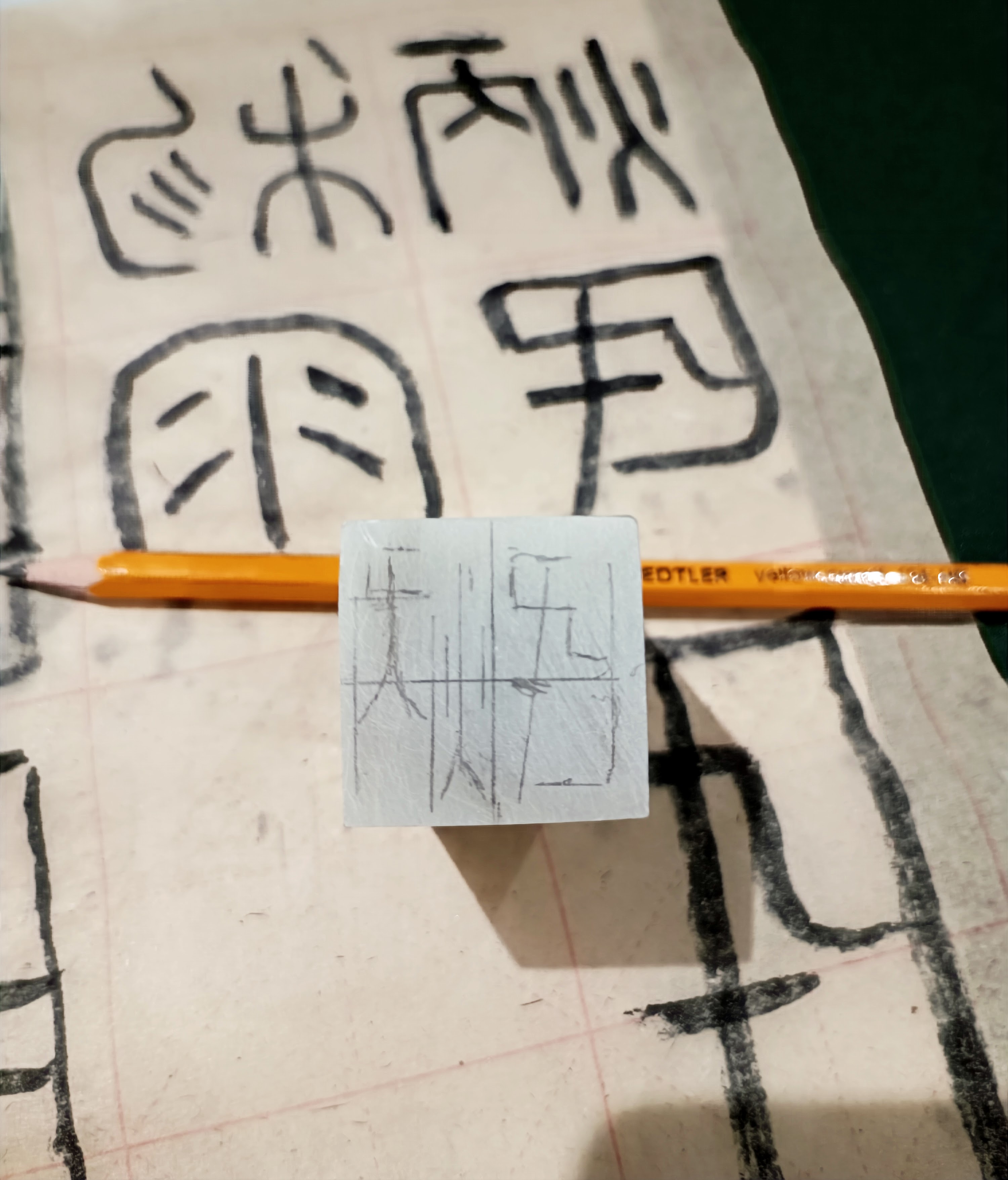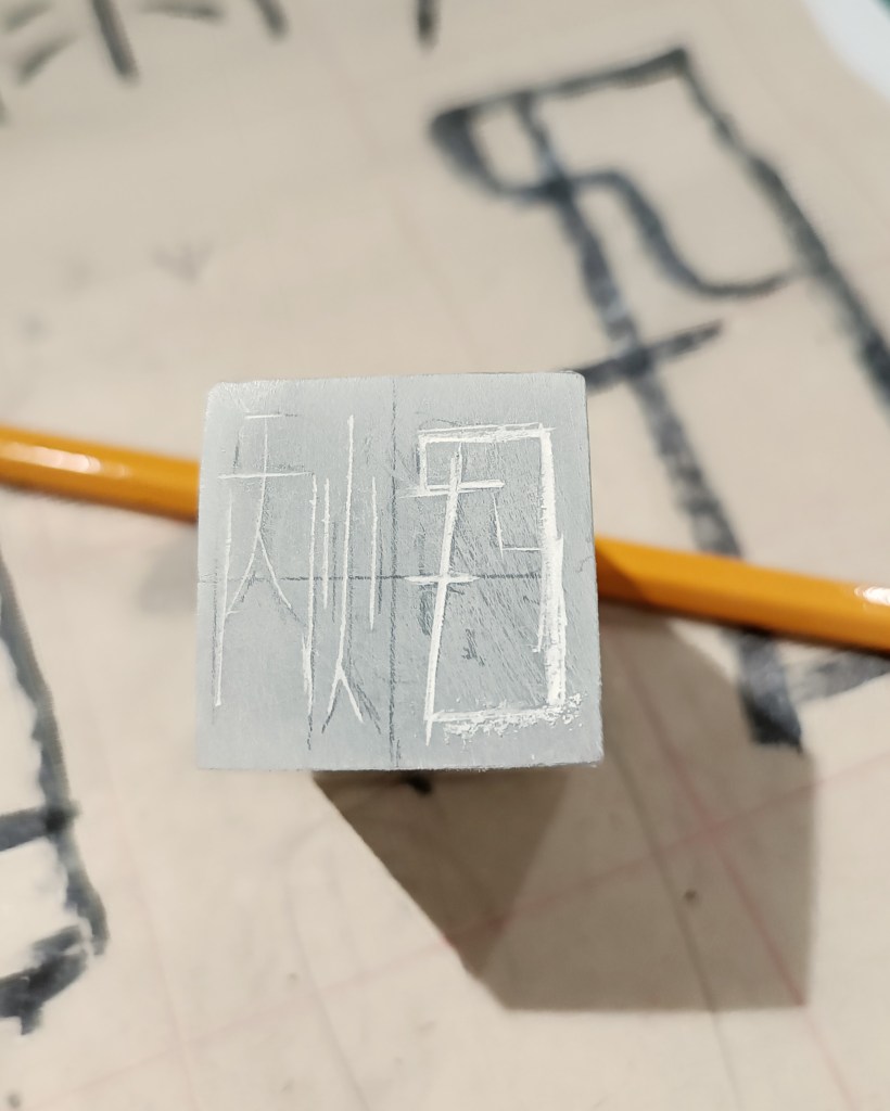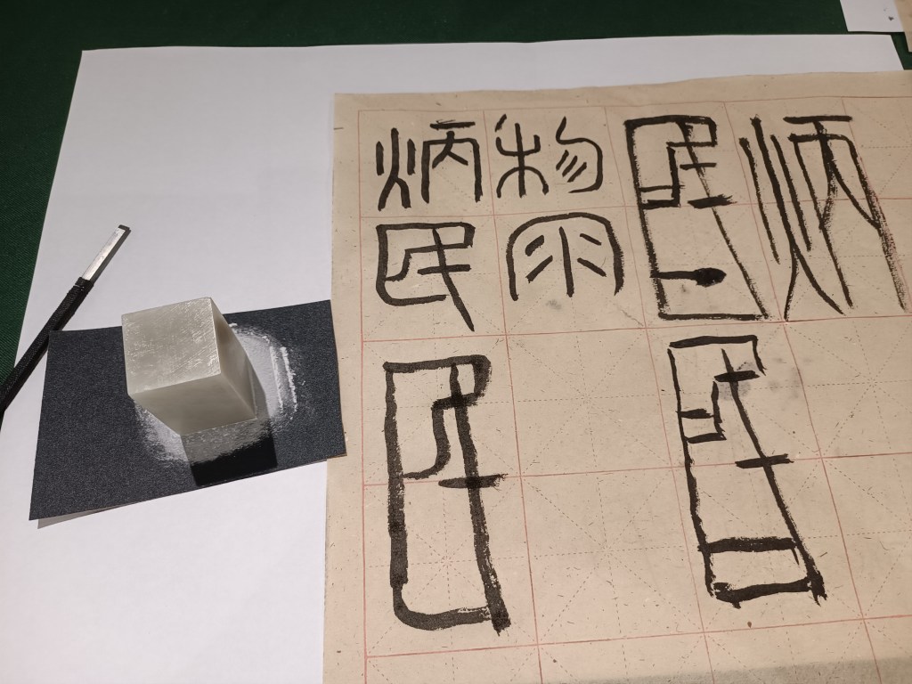 我們自己選擇最多四個 想要雕刻的文字,我選擇了「炳民」。他教我們到網上搜尋文字的篆書體,先用毛筆寫在宣紙上,將宣紙反轉,然後用鉛筆在已經用砂紙磨平的印章面上臨摹 那反轉的篆書體字,