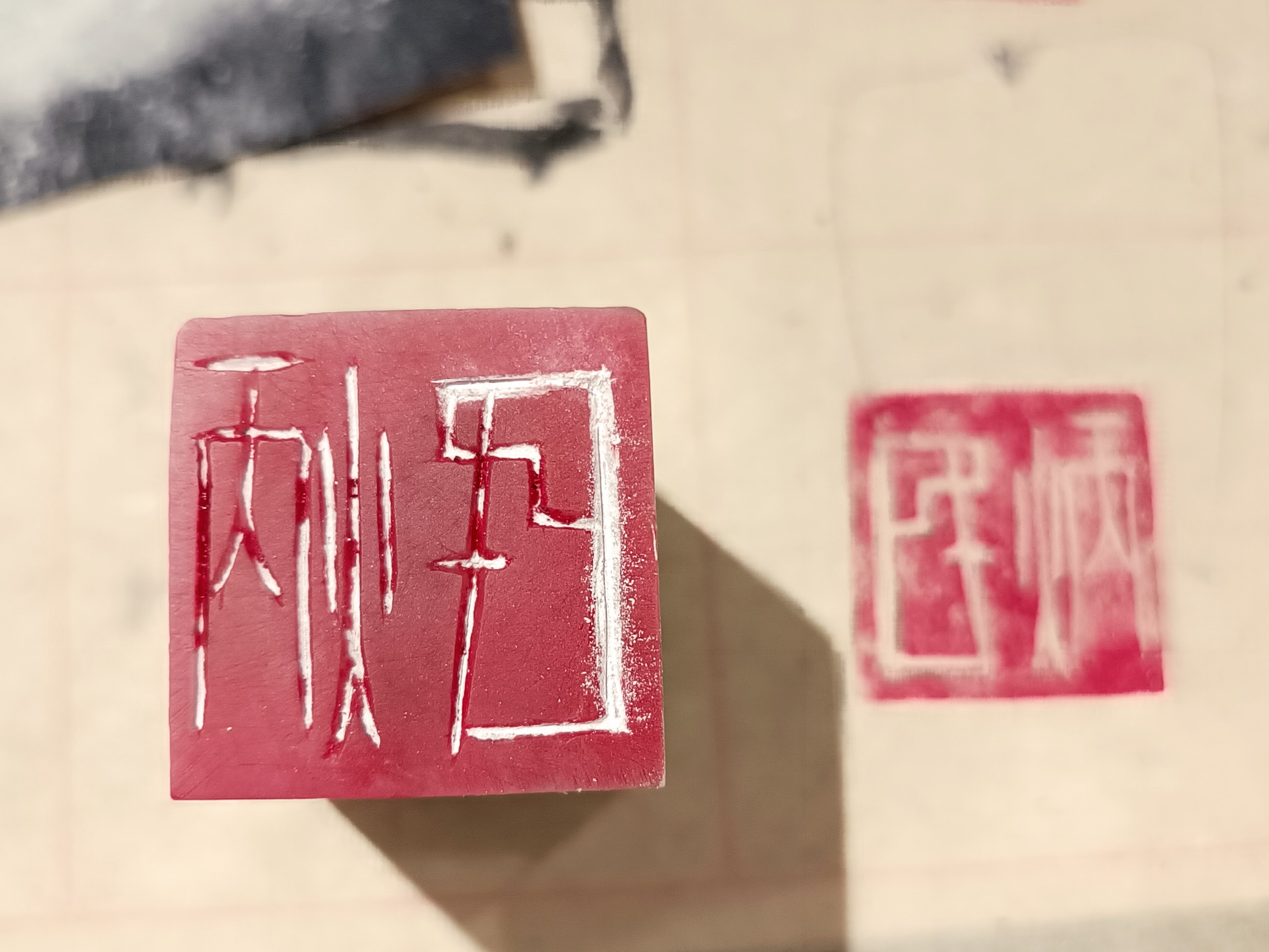 我們要好專注地完成以上的步驟才不會刻錯。初步製作完 會嘗試將它印出來看看效果,之後再微調。因時間有限,所以老師叫我們刻陰(白)文,陰(白)文印即是印章文字或圖像凹下的印章。印章鈐蓋出來的效果印底呈紅色,文字呈白色。書畫用印,姓名印多用陰(白)文。