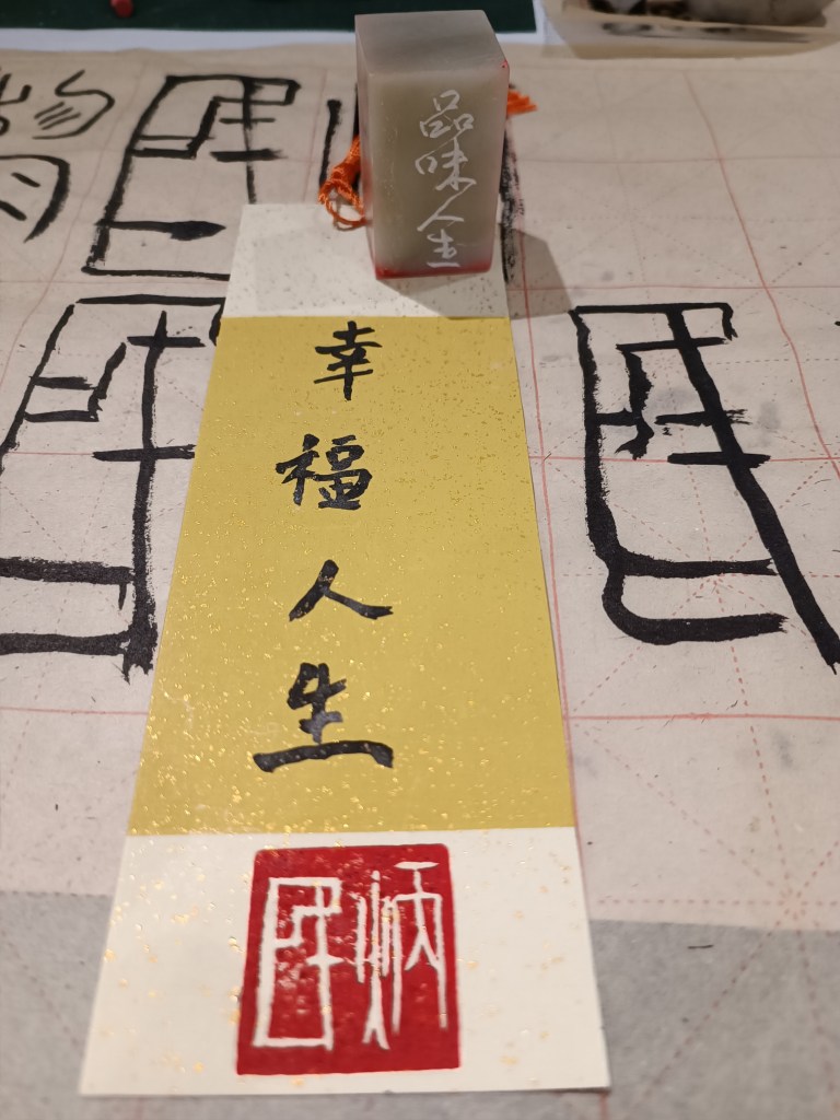 印出來給老師評估及略為修改後,老師又幫我再印章左旁邊 隨意刻上「品味人生」一句,作用是當我們用三隻手指握著印章 蓋印時,拇指感覺到左面的凹凸便知道 印章方向正確,不會將它左右調轉。老師更給我們一張書籤, 讓我們在上面寫上座右銘。我在上面寫上「幸福人生」,然後用新的印章蓋印在書籤。