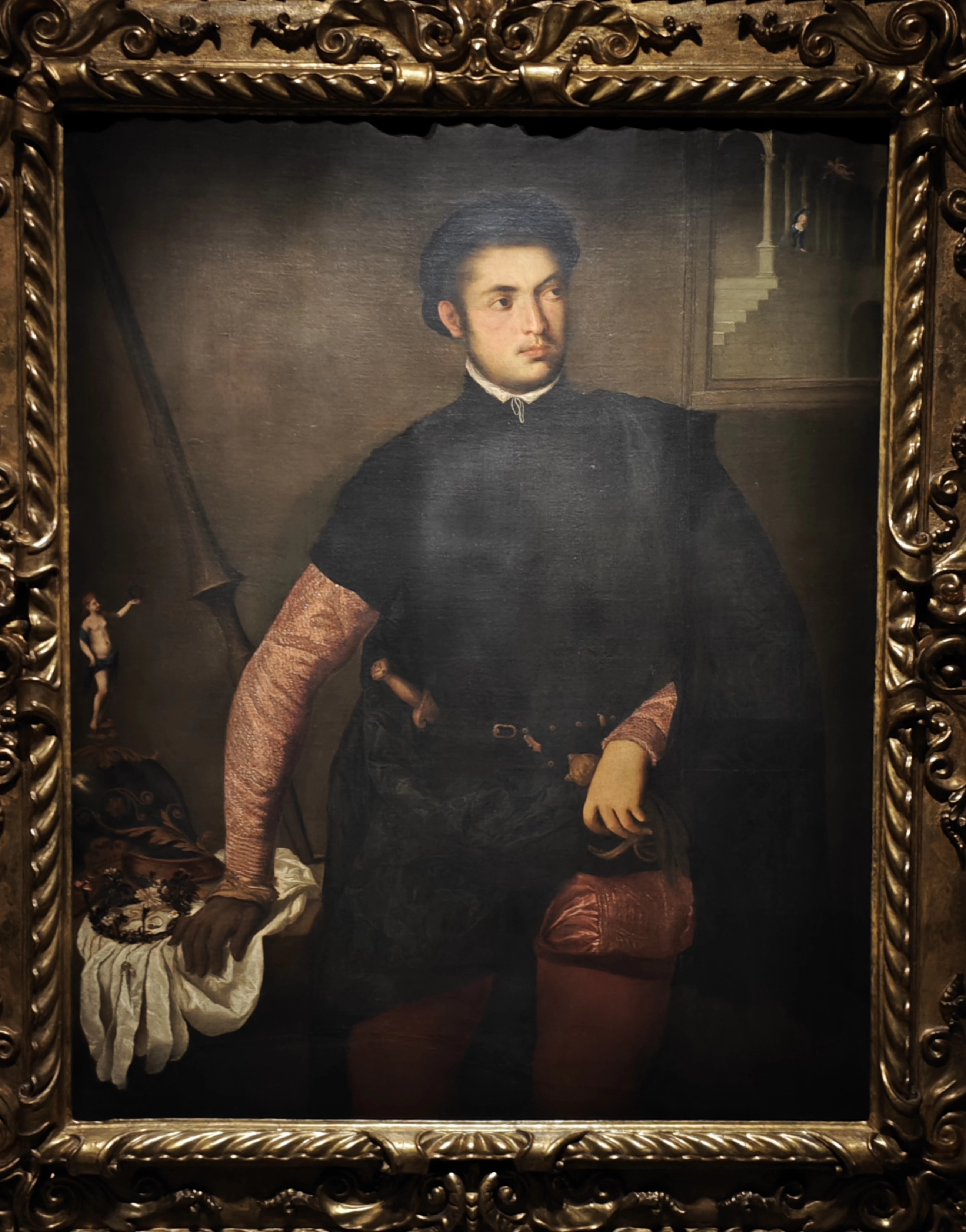 Portrait of Tommaso Mosti 1520 Titian 托馬素莫斯蒂肖像 -畫中人優雅時尚,栩栩如生。 托馬素莫斯樞機主教。他身穿帶有毛皮襯裹和可拆下袖子的大衣。高領襯衫鉓有黑色刺繡花邊,優雅時尚,是美男子無誤。