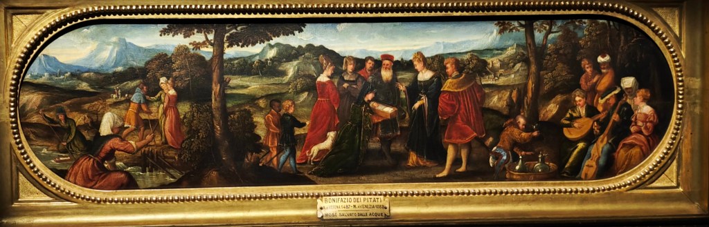Veronese’s Moses Rescued from the Water is a fête champêtre, and Pharaoh’s daughter enjoys alfresco entertainment. Surrounded by courtiers and ladies waiting, Pharaoh’s daughter’s pleasantries are interrupted when Miriam presents her with the infant Moses.