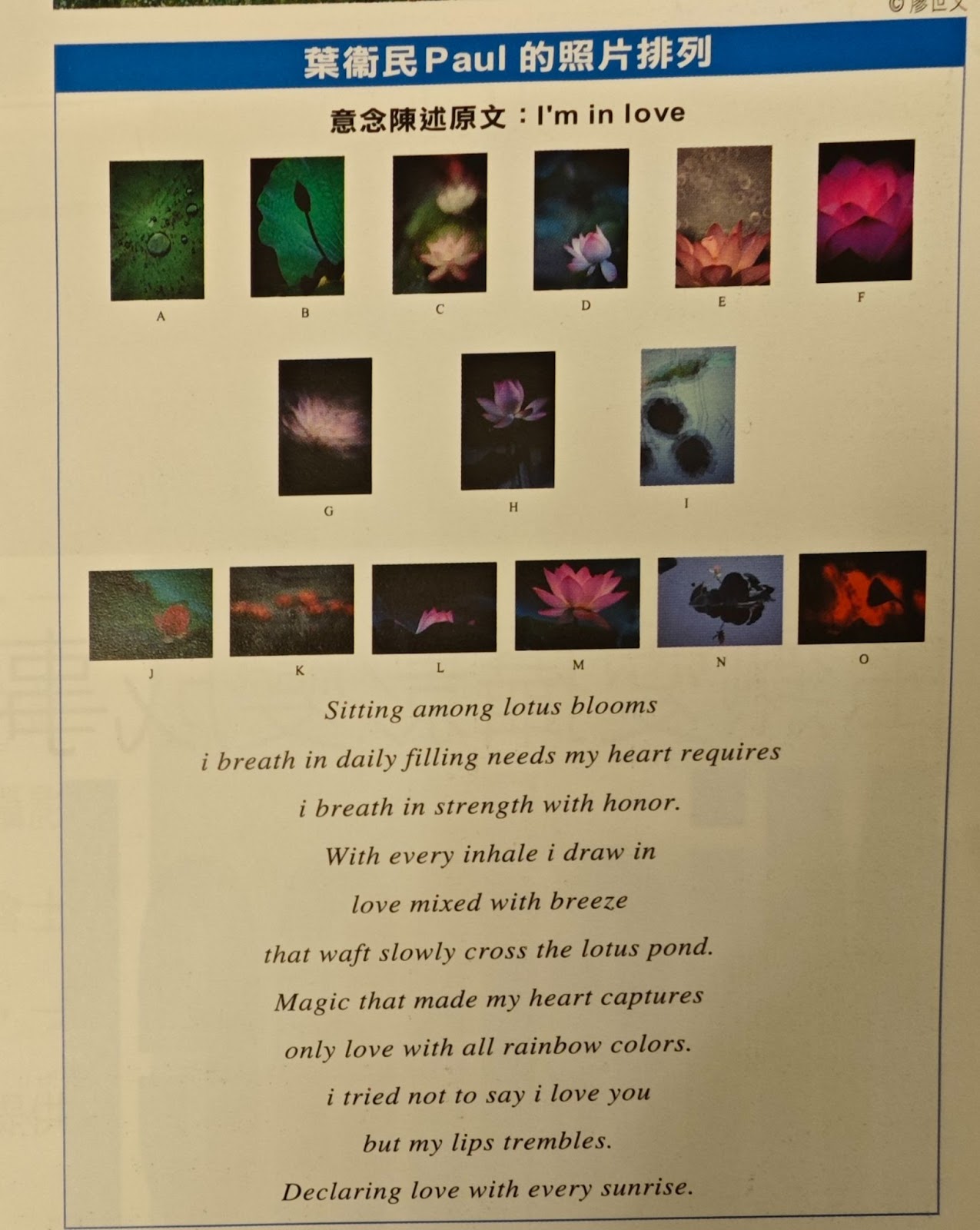 攝影是瞬間的藝術 ,是用光來繪畫 從對美的感應 , 將大自然瞬間的美化為永恆的美。我們可從相片中的攝影角度, 構圖, 色彩, 光影, 質感及其傳遞的信息意念來欣賞它. 先有想法,構思,準備 及等待,再用技巧及審美眼光來捕捉著一瞬間的光映境物而將它變成永恆境像。