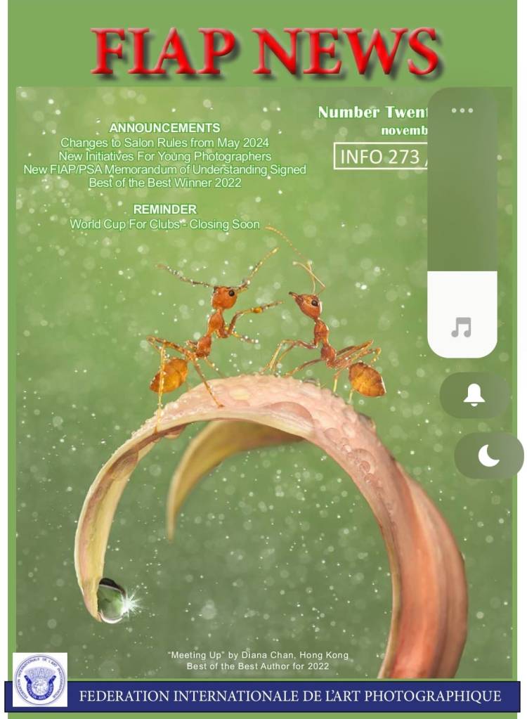 最近我的學妹 Dr. Diana Chan剛剛獲取了 FIAP 的 Best Author Winner for 2022大獎,她於2016年才開始對攝影產生濃厚的興趣,我記得幾年前,她也有出席由 她的同班同學安排在荔枝角 D2廣場中菜廳 舉辦由我主講的《如何拍攝好相》攝影講座 ,現在她已獲得以下的種種銜頭: E.FIAP ,F.RPS (Royal Photographic Society),F.HKAPA (HK Art of Photography Association), F.APU (Asia Photographer Union) ,GM.APS (Agile Photographic Society) 及M.NPS(Nicosia Photographic Society), 並多次 入圍美國攝影學會不同組別世界十傑。
