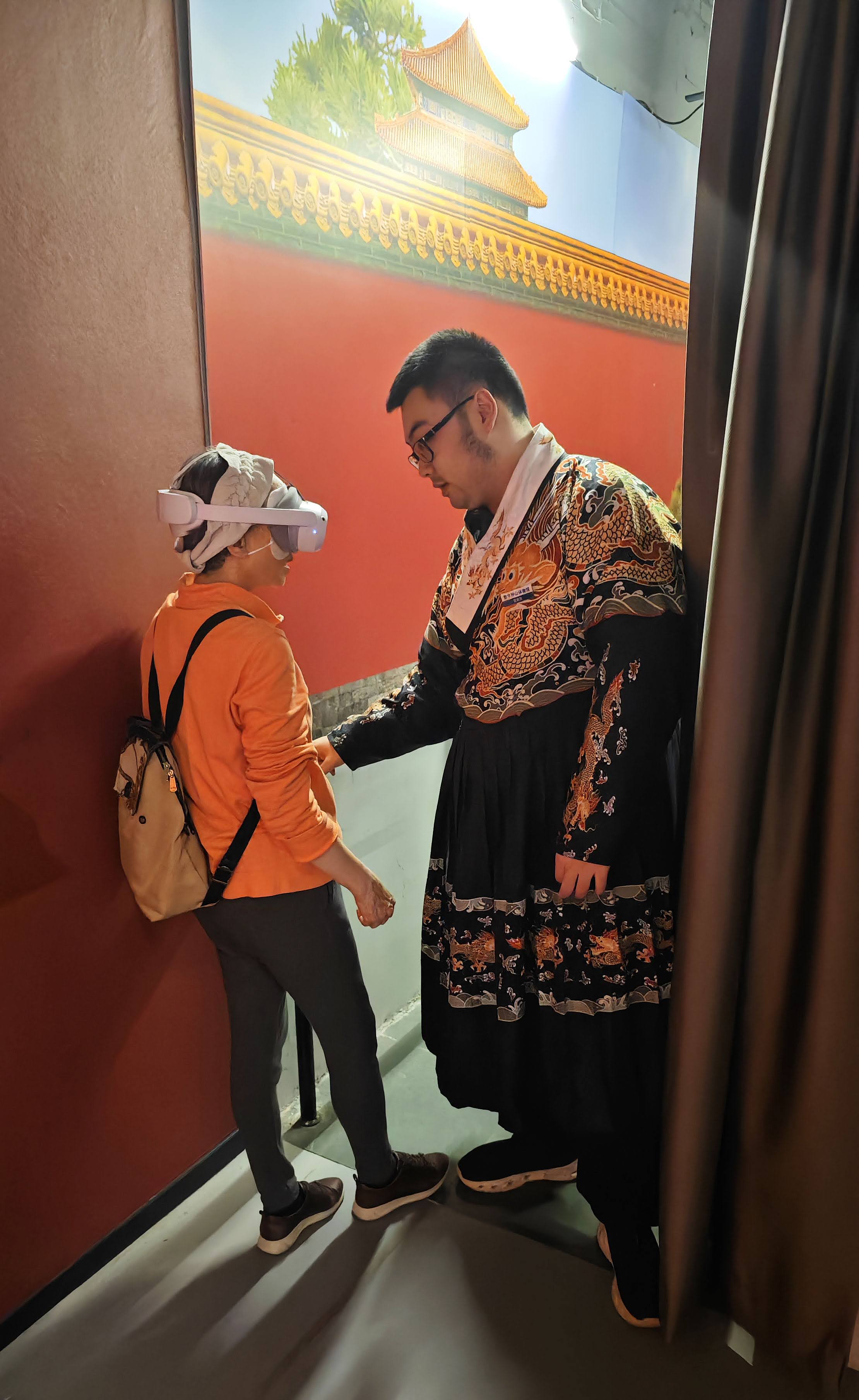 帶了虛擬現實眼鏡,工作人員領導我們入一間房,左手扶住鐵欄,之後體驗開始。我們跟著眼前螢光幕見到的虛擬人物,由它領導下參觀紫禁城,我們可以360度觀察這個逼真的模擬場景,這個十分特別的體驗。
