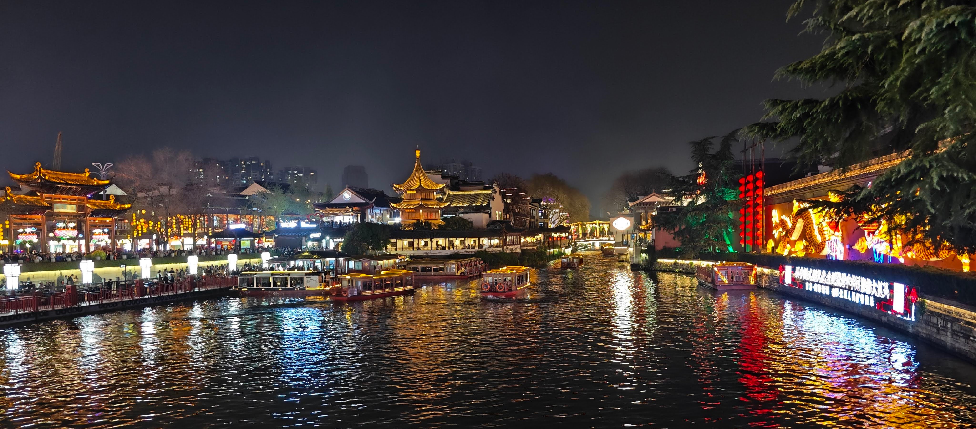 晚上遊覽夫子廟秦淮河。「乘畫舫,遊秦淮」是來到南京的第一必遊體驗,秦淮河被視為南京的母親河,在城內的河段更被稱為「十里秦淮」,《烏衣巷》( 劉禹錫:朱雀橋邊野草花,烏衣巷口夕陽斜。舊時王謝堂前燕,飛入尋常百姓家。)、朱雀橋這些耳熟能詳的唐詩地名全在這裡。