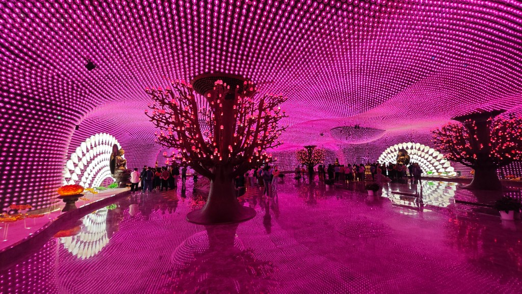 佛頂宮是利用廢棄的60多米深的礦坑建成的。它是世間唯一的佛頂骨舍利子的長期供奉地。從地面我們要乘搭電動樓梯 落七層才可以到達供奉地。