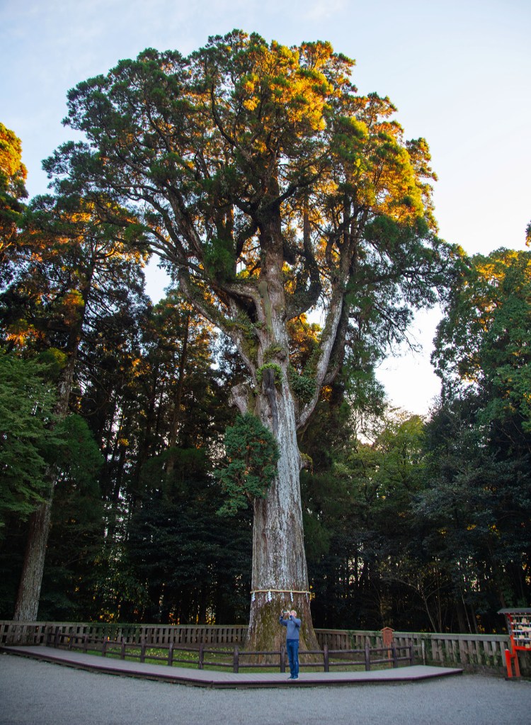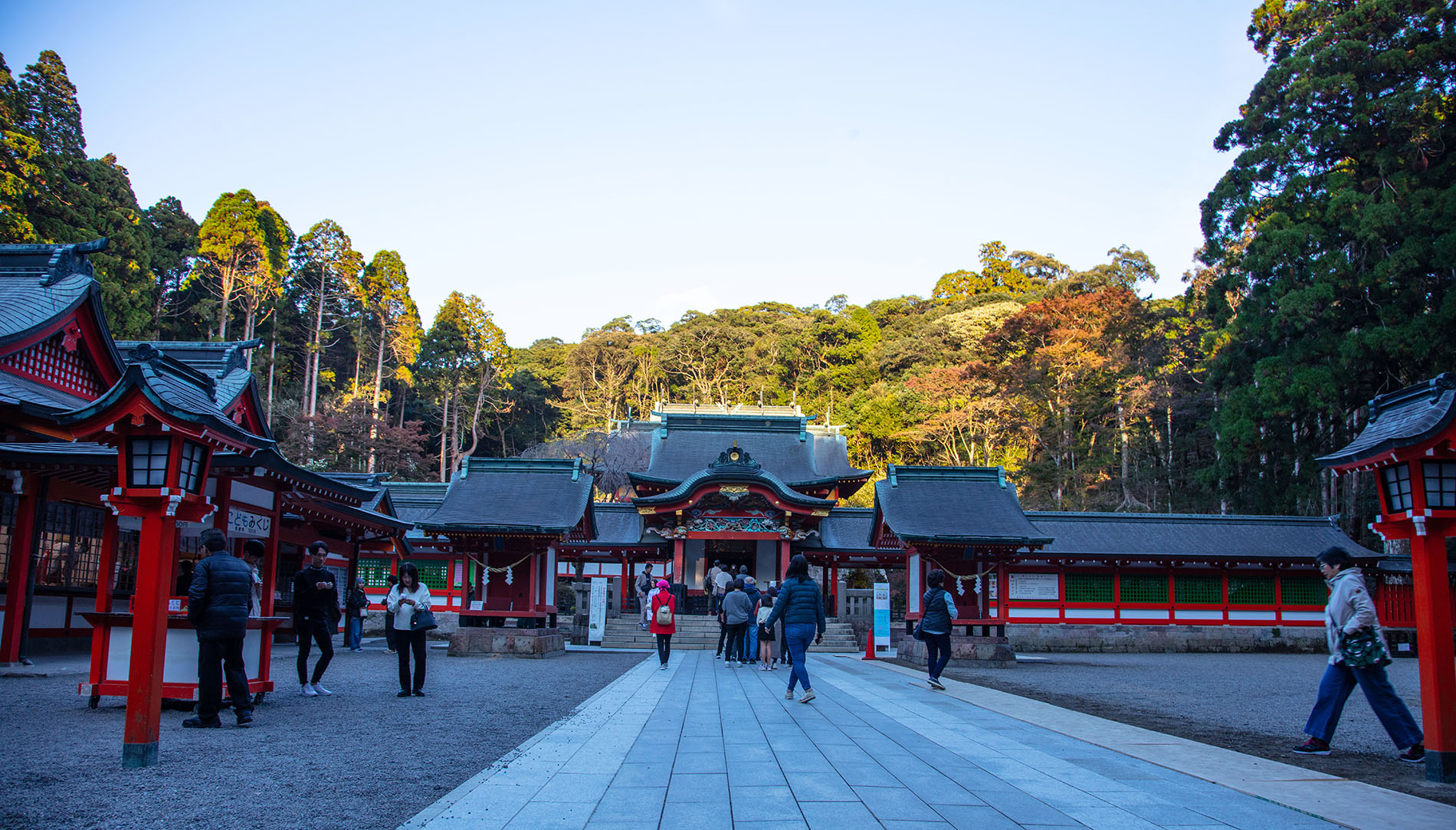 最初的「霧島神宮」建於高千穗峰旁,但之後因火山爆發而幾經重建和遷址。現在的社殿是於約300年前修建而成。殿內漆滿鮮豔的朱紅色,五彩繽紛的雕刻佈滿各處,展現豪華絢爛之美,更被指定為日本國家重要文化資產。而這座有「天孫降臨之地」之名的神宮,據說在保佑心願達成方面相當靈驗。在霧島神宮內有株推測樹齡為800年的神木,這棵高約35公尺且樹幹周圍長約7.2公尺的宏偉杉木,相傳是九州南部一帶杉木的始祖。若繞到神木後方往上瞧,則可找到形狀宛如戴著烏紗帽的人正合掌參拜般的樹枝。