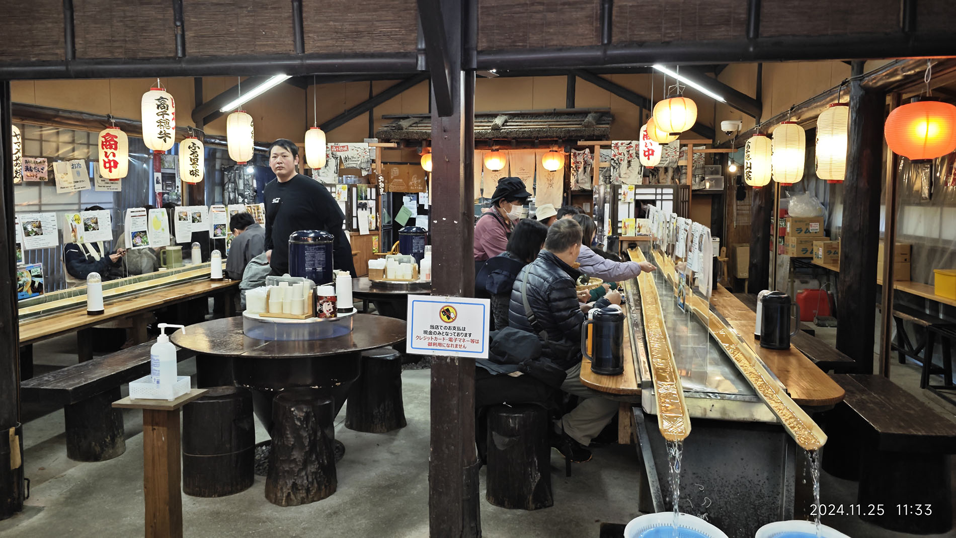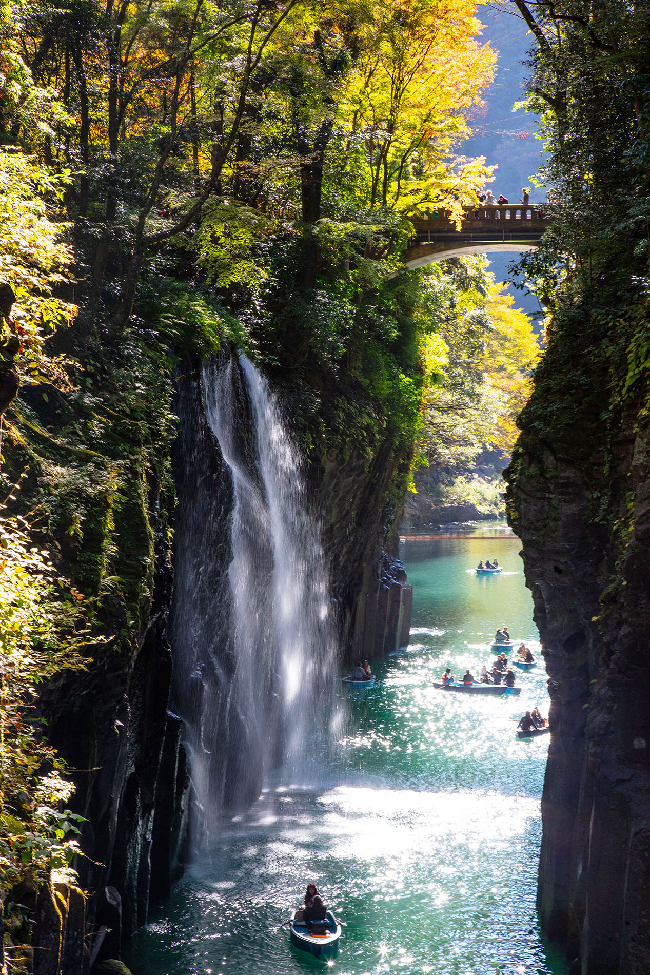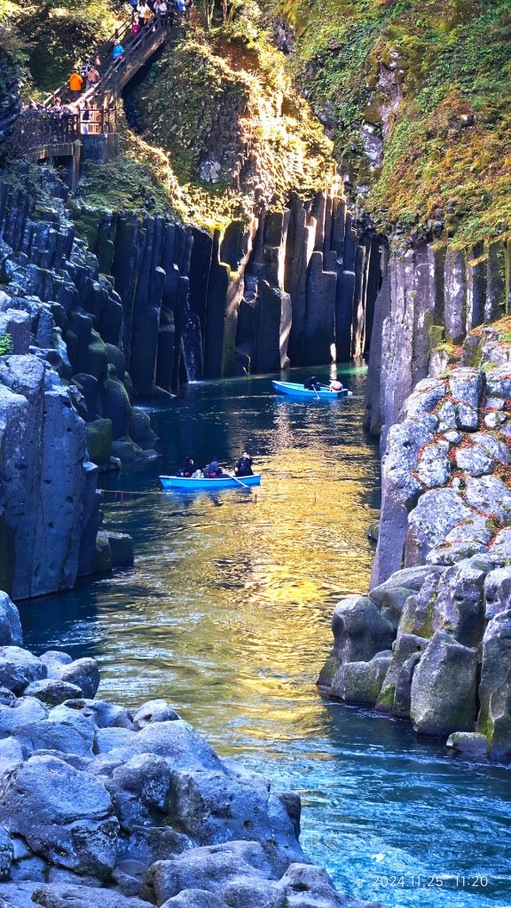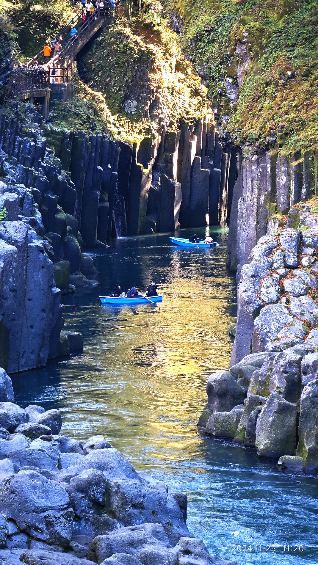 第五天前往神話之里「高千穗峽谷」。峽谷位於日本宮崎縣,五瀨川在峽谷中流過,又稱為五瀨川峽谷。峽谷為阿蘇山的火山活動所形成,約10萬年前的火山噴發產生的火山碎屑流沿著當時的五瀨川流下,冷卻後產生了具有柱狀節理的火成岩,後再經五瀨川河水的侵蝕,形成了今天高達80米至100米,綿延7公里的柱狀斷崖 。在峽谷內最著名的景觀則是被列入日本瀑布百選的真名井瀑布。在休息區無意中看「千穂之家 元祖流水麵」,它是一家擁有悠久歷史的餐廳,創立於昭和30年(1955年)。這家餐廳以其獨特的「流水麵」聞名,吸引了眾多遊客前來品嚐。
