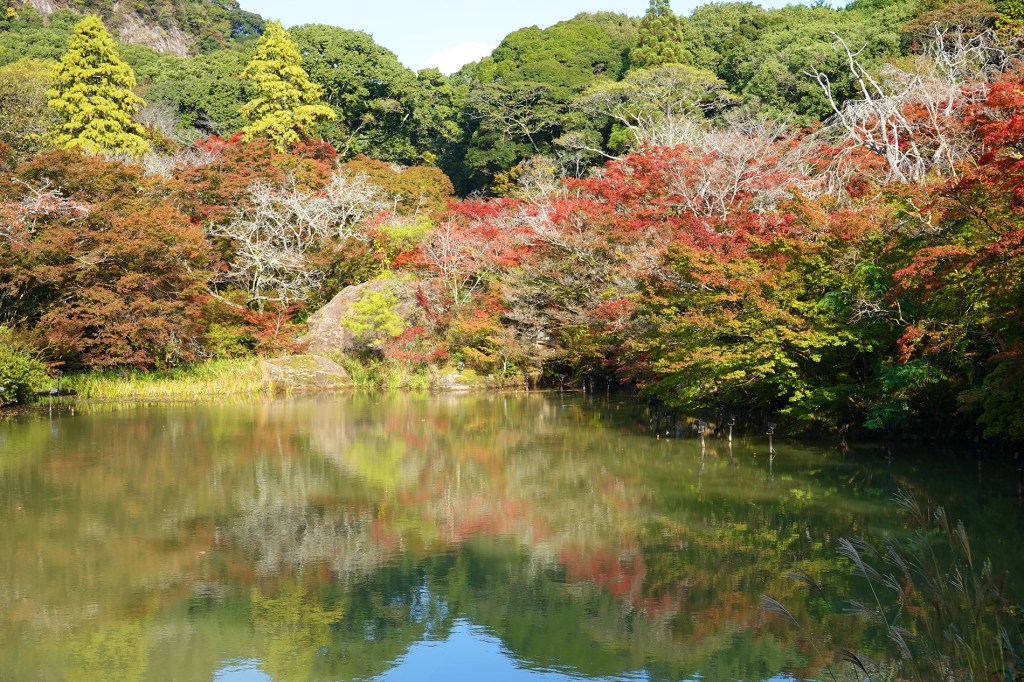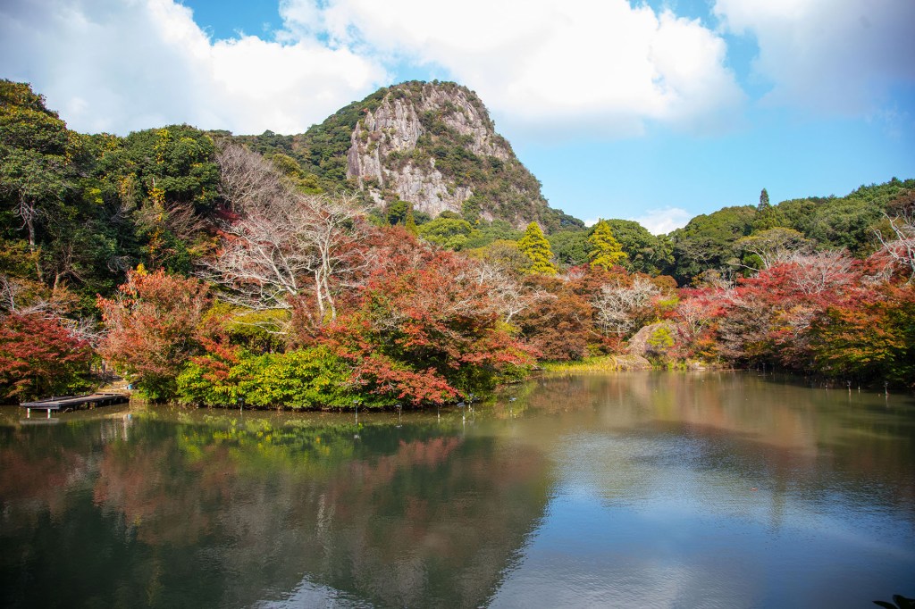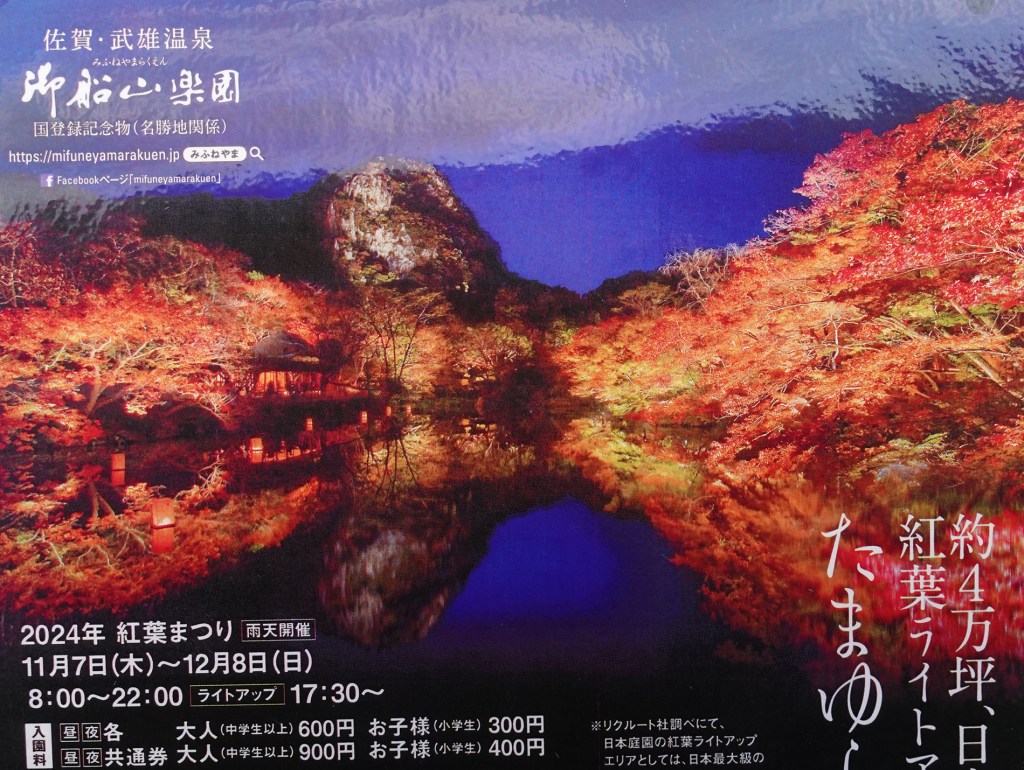 全程約60分鐘很快便過去。午餐吃佐賀牛創作料理。下午先去佐賀Saga紅葉百選的「禦船山庭園」。它的50萬平方公尺的園區為第28代武雄領主鍋島茂義所規劃。據傳因昔日神功皇后從新羅歸來時,曾將「御船」繫於其上,標高210公尺的御船山因此而得名,其為佐賀縣武雄市的象徵。今天天氣良好,風和日麗,庭園內池塘被楓樹四方八面包圍著,加上藍天白雲及池水紅葉倒影,現場景色真是十分震撼 ,拍出來的也是一張超美麗的風景相。