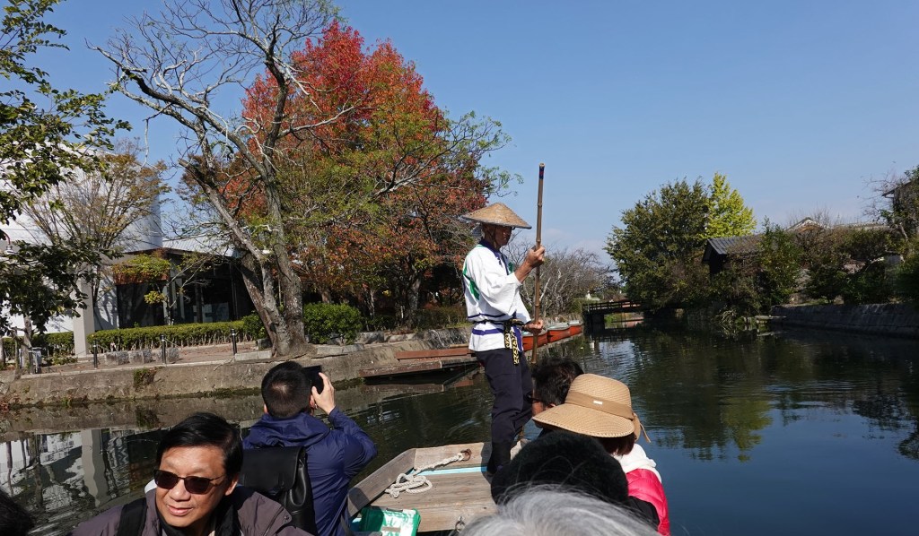 團公司按排了「柳川遊船」體驗活動,團友分乘兩艘木舟巡遊以前的護城河,沿途可以觀賞兩岸的紅葉及花草樹木,穿過狹窄的水門時候我們紛紛要低下頭,途中聽船夫吟唱當地的小調,