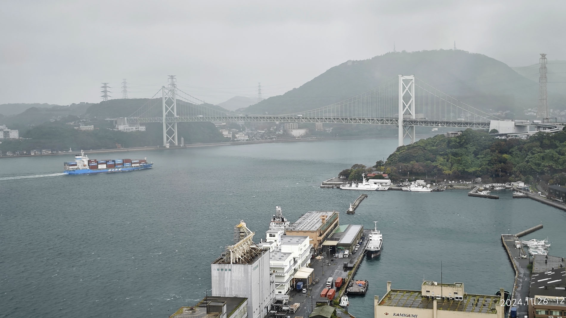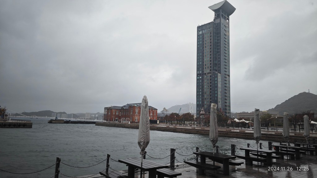 今天是這七天團裏面唯一的一天下雨及大風。 我們先到103m高展望台,從高處俯覽整個門司港區,看到關門大橋 。關門大橋1973年建成行車鐵橋,長1068米、高61米、闊26米, 將本州下關與九州的門司連接起來。