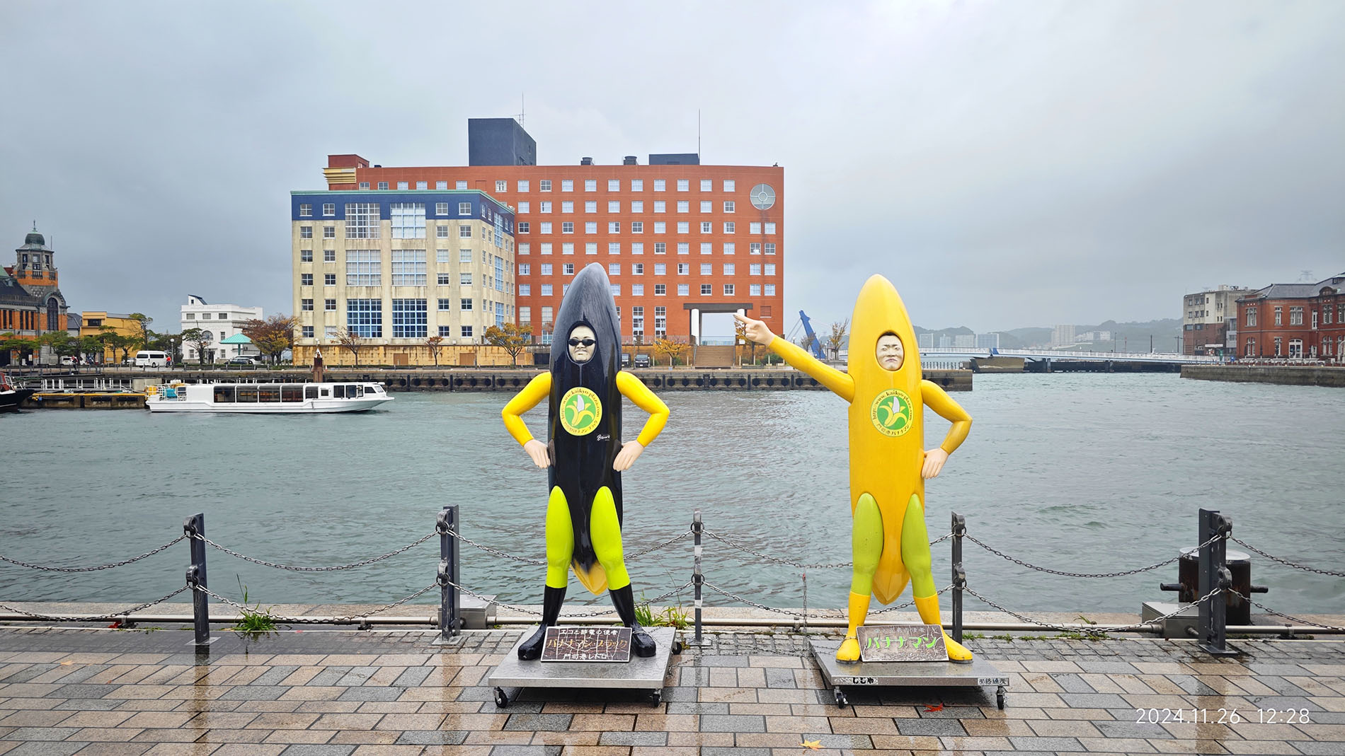 之後在懷舊復古區漫遊,我們見到有兩個香蕉人。在日治時期外銷至日本的台灣香蕉,是以門司港為集貨地,大部分香蕉都是帶青色、尚未完全熟成時就運往日本,部分過熟、易損壞的香蕉就會先在門司港進行露天兜售。