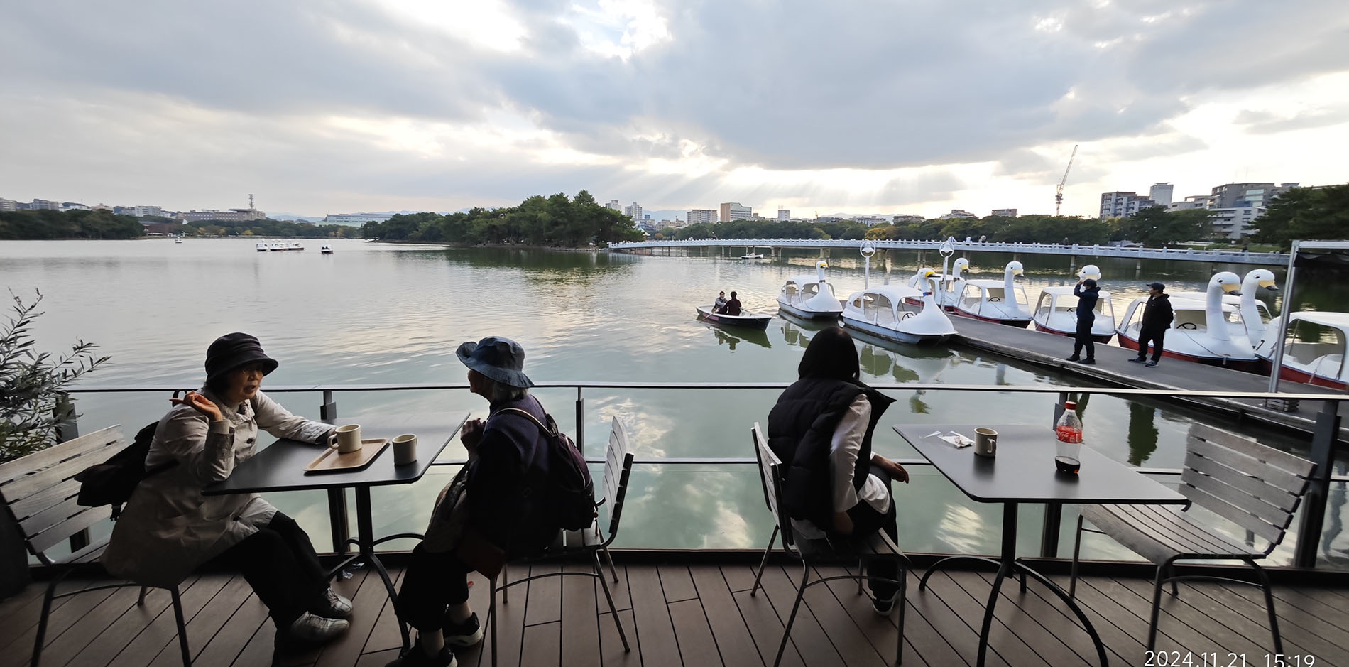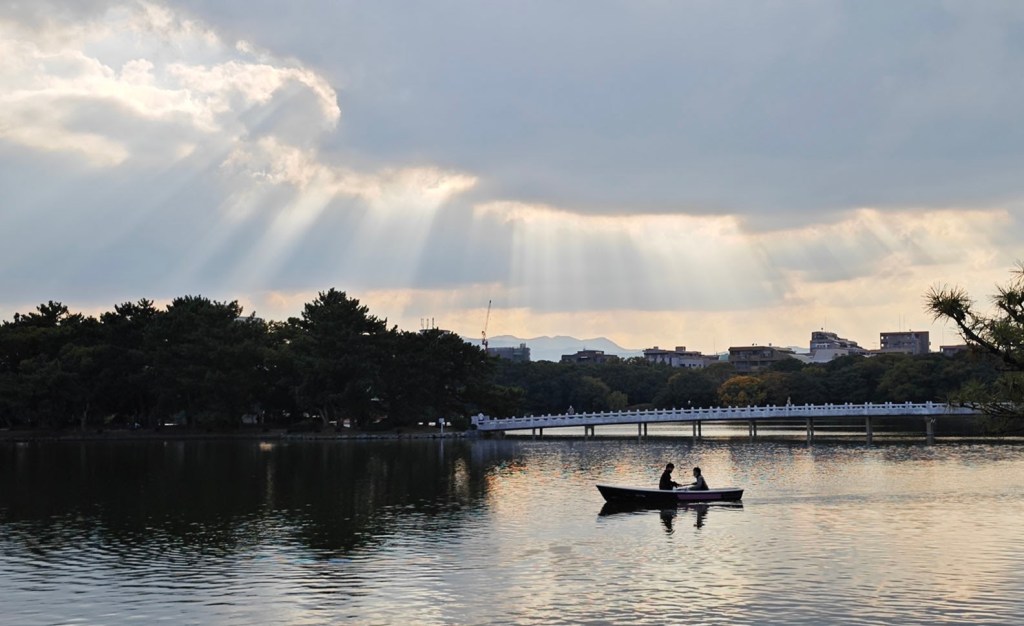 第一天下午到達福岡,先去紅葉名所「舞鶴公園」 ,它也是福岡市內賞櫻最為知名的公園。可惜 現在是秋天而今天紅葉不多 ,好彩剛剛有耶穌光灑在 大濠池上的泛舟,總算影到今次旅行的第一張滿意的相片。
