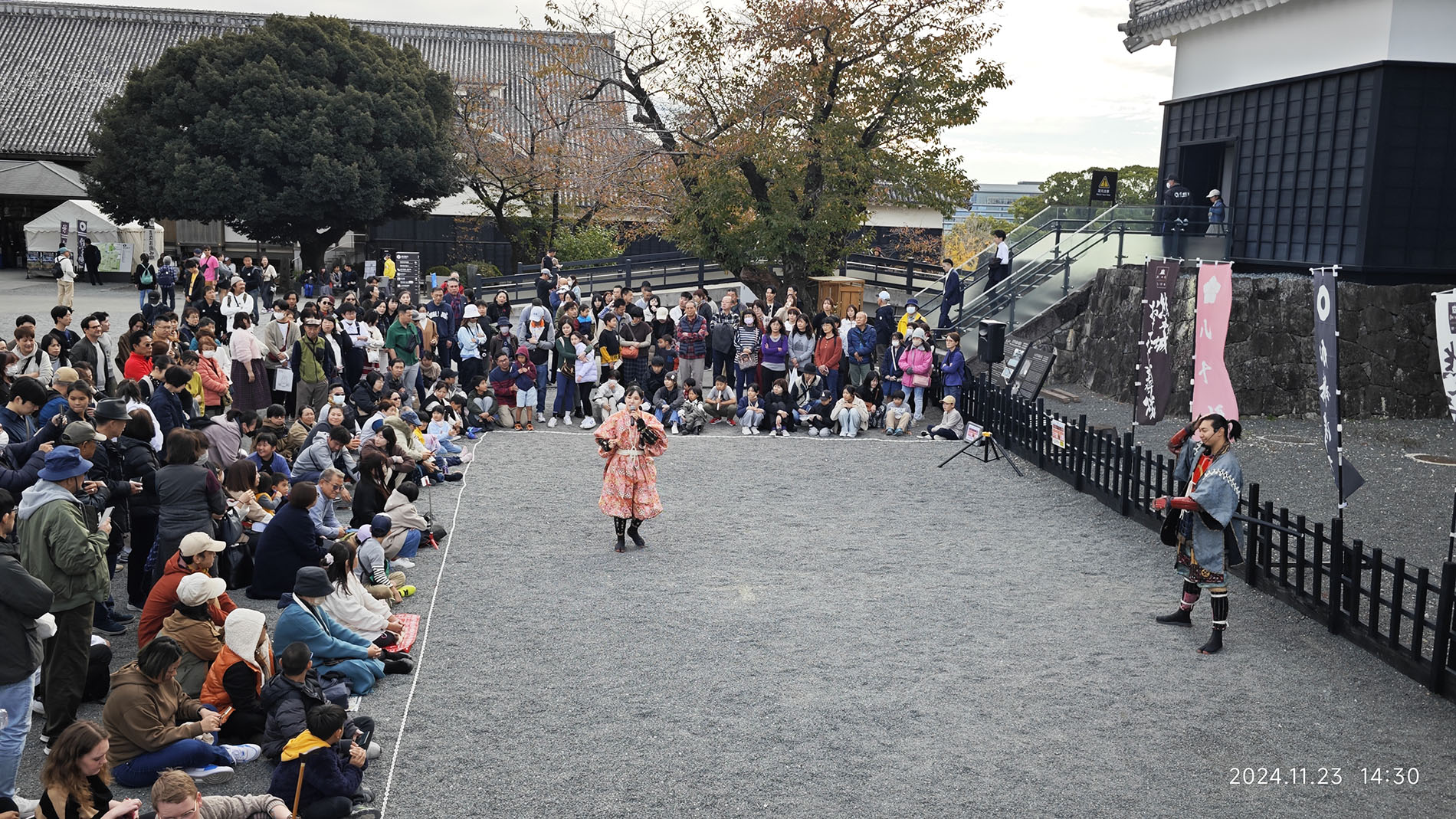 因為復修中,所以我們要多行十多分鐘才到達熊本城前面的廣場。 廣場上剛好有藝人表演 ,逗留一會便要匆匆前往鹿兒島吃晚餐黑豚料理 。