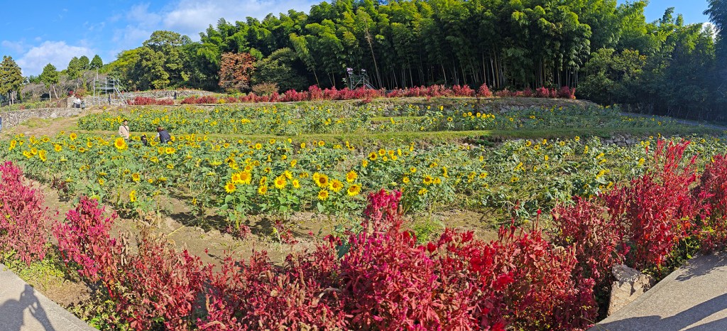 第三天前往「山田向日葵園」( Yamada Sunflower Garden)。園內約有十萬株向日葵。向日葵是菊科向日葵屬的植物。秋天看到向日葵是因為「山田向日葵園」 用梯田農地種植,所以要等秋天種稻的季節完了先可以種向日葵。