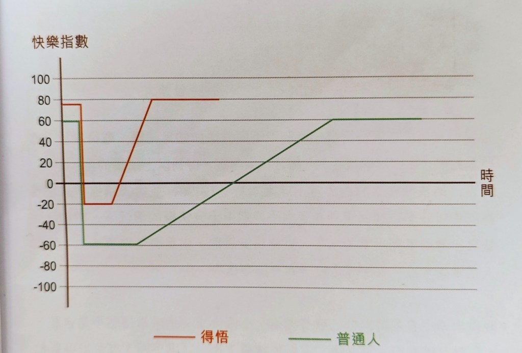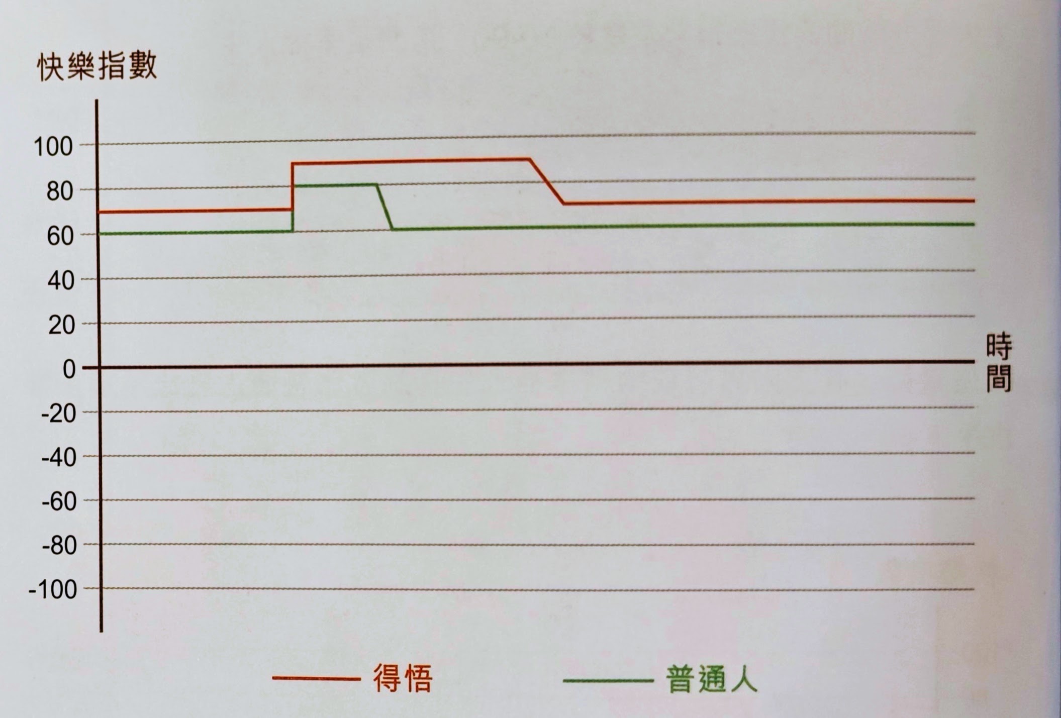得悟者遇上十分快樂的情況下, 能延長由高位回落到正常的幸福指數的時間,使到人生中大部分時間快樂指數都能處於滿足的水平,人便算是獲得到一個幸福的人生。