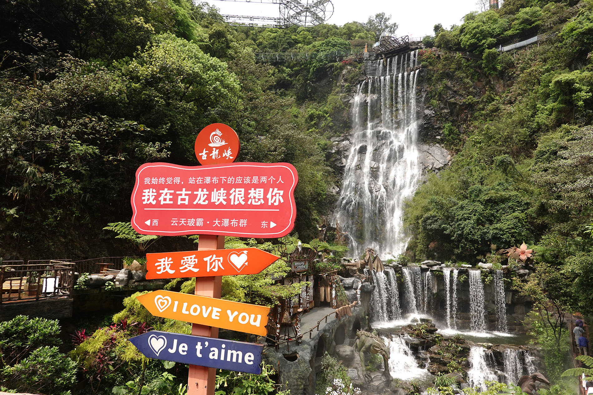 早上我們前往古龍峽。古龍峽是國家AAAA級景區,以驚險刺激的「雲天玻霸」玻璃橋、網紅峽谷漂流及萬丈崖瀑布聞名,素有「南粵小張家界」之稱。景區入口處有網紅河谷仙峽奇景、紅橋河畔及古龍酒店。難得的是,這次旅程中的所有排隊情況都比想像中順暢,我們順利乘搭觀光巴士抵達半山的猛龍服務區,然後開始步行前往萬象瀑布及雲天玻霸。沿途擺放了不少恐龍模型,彷彿走進了侏羅紀公園。萬丈崖的主瀑布——雲龍大瀑布,高達131米;而「雲天玻霸」玻璃橋則是世界最長的高空玻璃橋,全長1314米。